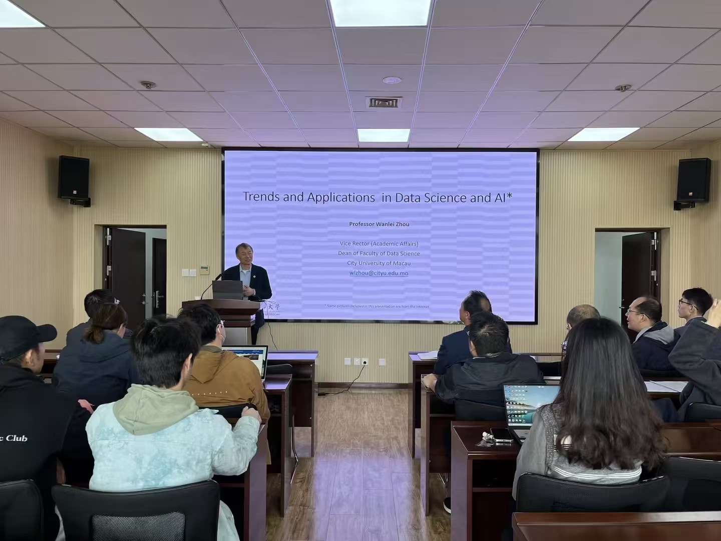 本次沙龙以“大数据与人工智能在数据科学和AI中的应用”为主题,特别邀请了澳门城市大学副董事长兼永利集团304am官方入口经理周万雷教授做报告。周万雷在报告中指出,数据科学与人工智能已成为当今数字化社会中极具影响力的学科领域,在推动决策制定、创新与效率提升方面具有重要意义。他详细阐述了数据科学和人工智能的跨学科属性、未来发展趋势及其在全球范围内的广泛应用。此外,周万雷还分享了澳门城市大学在跨学科课程开发方面的经验,并提出学好数据科学和人工智能的关键要素,并简要介绍了其最新研究成果。